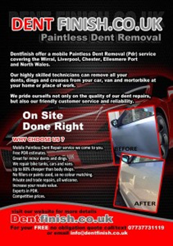 Connect with DentFinish on Facebook. DentFinish provide Paintless Dent Removal (PDR) in Chester, Cheshire, Wrexham, North Wales, The Wirral and Liverpool.